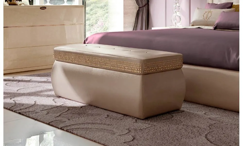 Банкетка с возможными вариантами обивки в кожу или ткань. Декорирована заклепками. Возможен заказ с хромированными металлическими деталями без наценки.