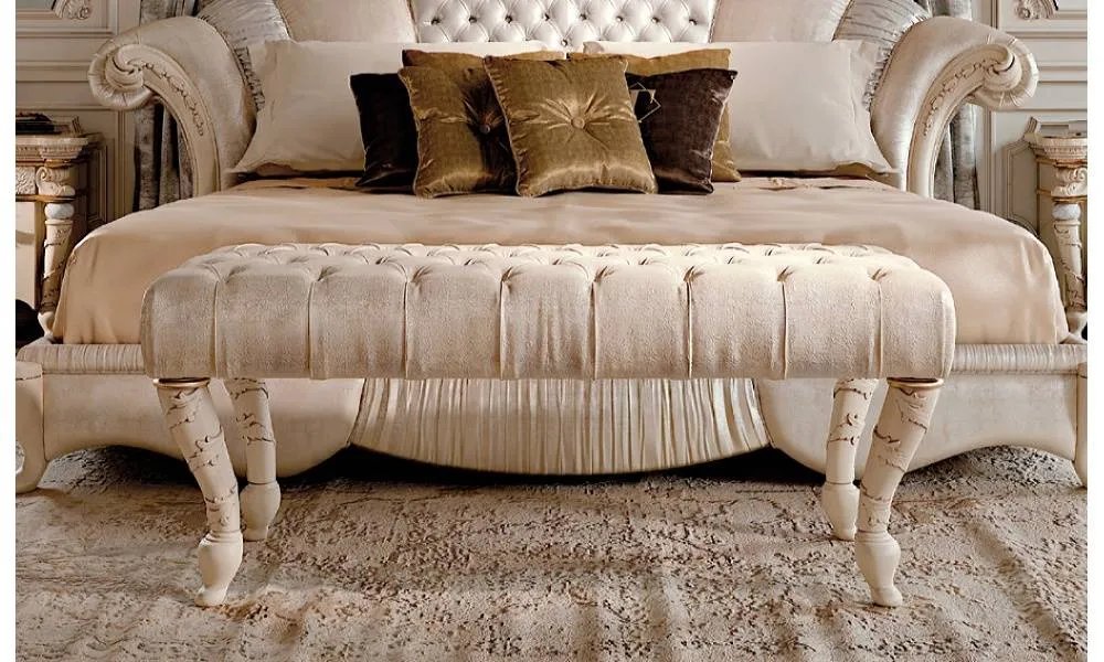 Банкетка на резных деревянных ножках с матовым финишем. Обивка сидения выполнена в технике капитоне, возможны другие варианты ткани.