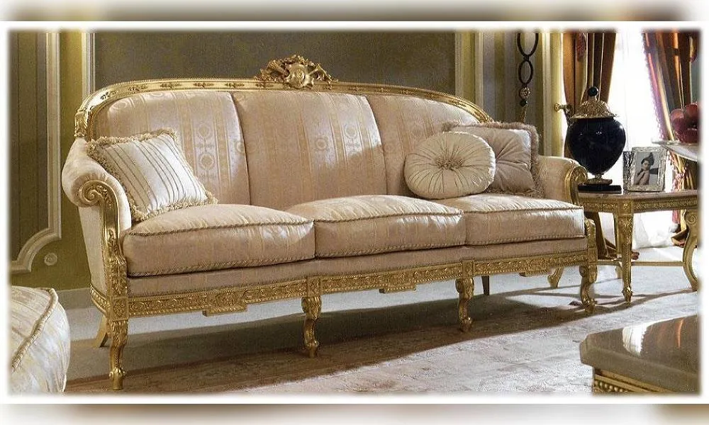 3-х местный диван. Украшен золотой фольгой. Наполнение - полиуретан. Декор ручной работы. Возможны другие цветовые варианты отделки и обивки.