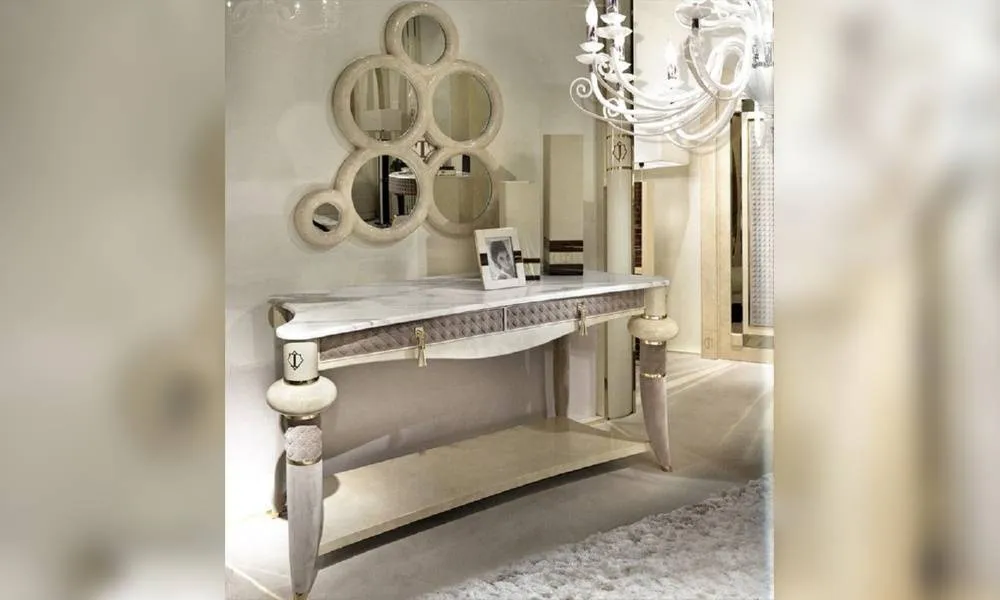 Консоль с деревянной структурой. Ножки обиты тканью. Столешница выполнена из мрамора.