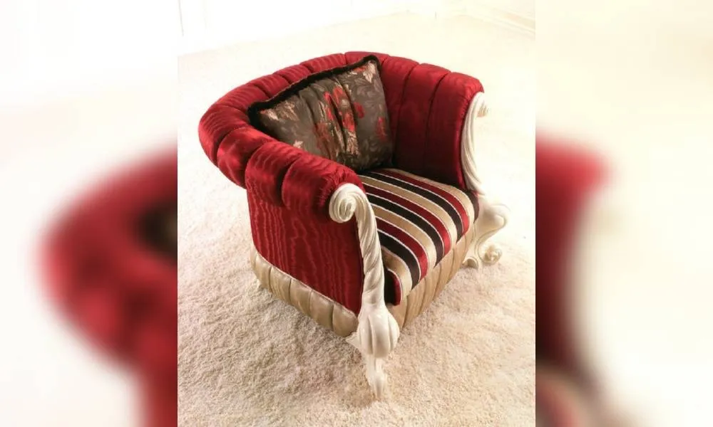 Кресло, спинка расположена на одном уровне с подлокотниками. Возможен вариант диван-кровать. Декорировано резными элементами. Наполнение - полиуретан. Возможны другие варианты обивки.