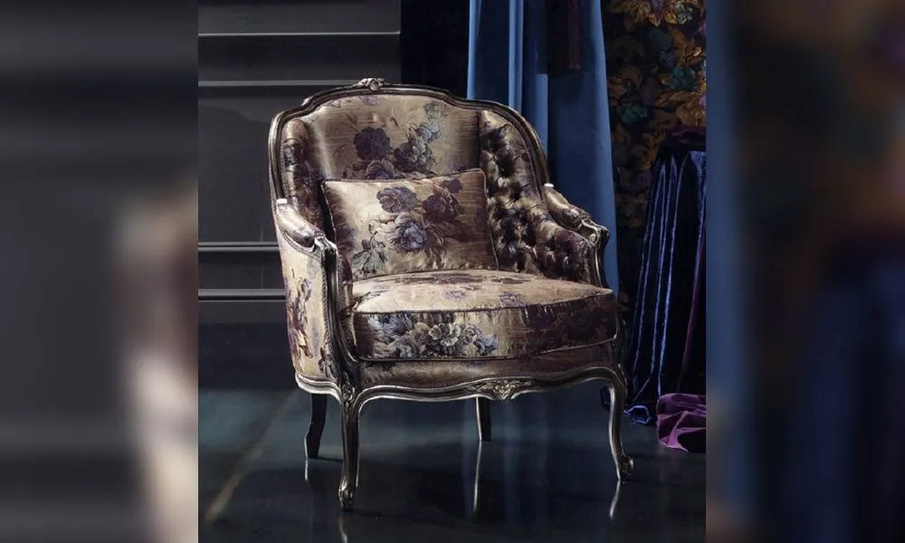 Кресло. Подлокотники обиты в технике капитоне. Украшено резьбой. Возможны другие варианты отделки и обивки, в том числе в ткани клиента.