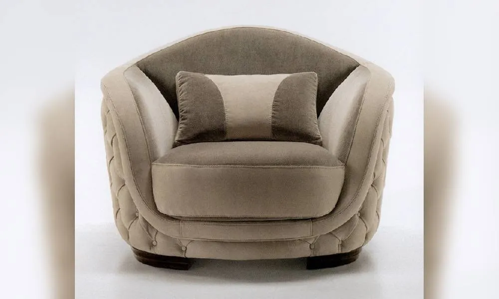 Обитое кресло с деревянными ножками. С внешней стороны обито в технике капитоне. Возможны другие варианты отделки и обивки.