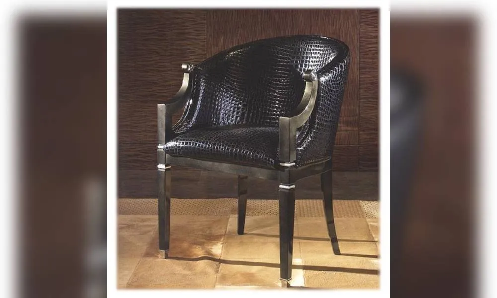 Кресло на высоких ножках. Наполнение - полиуретан. Детали в серебряной фольге. Обрамление ножек - полированная нержавеющая сталь. Декор ручной работы. Возможны другие цветовые варианты отделки и обивки.
