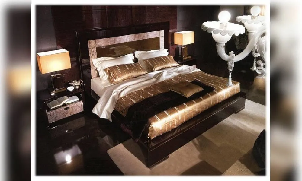 Двуспальная кровать с высоким изголовьем, без изножья. Декорирована кожаной аппликацией. Декор ручной работы. Возможны другие цветовые варианты отделки и кожи.