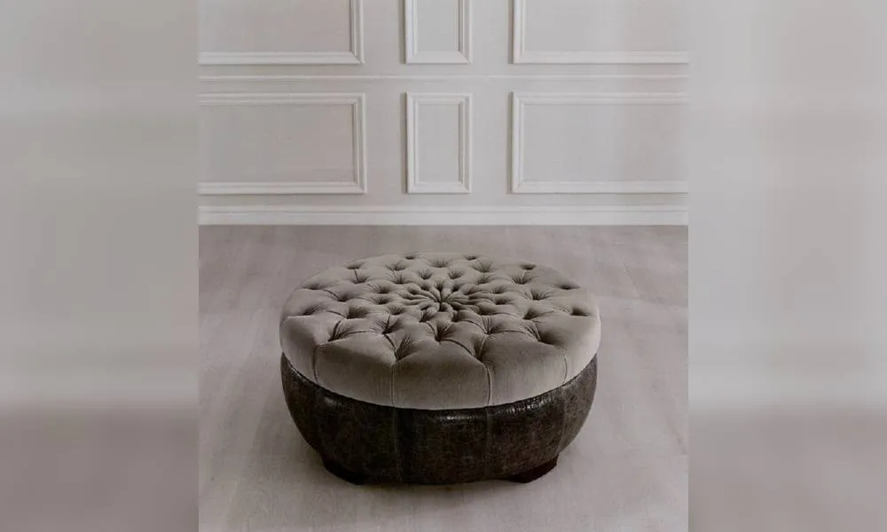 Круглый пуф. Сидение обито в технике капитоне. Возможны другие варианты отделки и обивки.