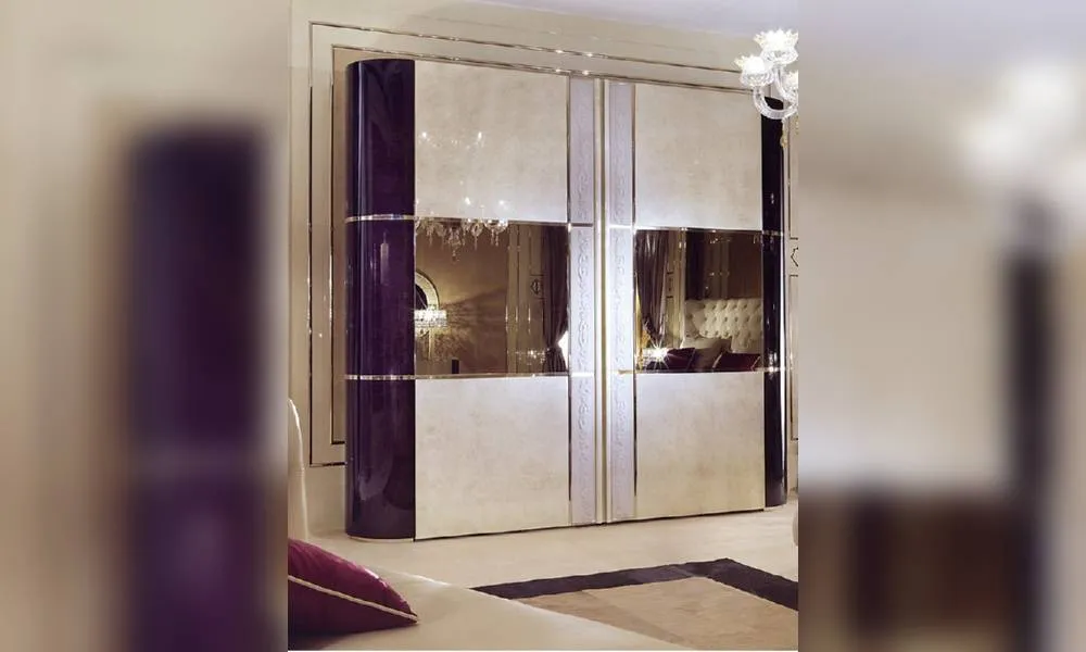 Шкаф с двумя раздвижными компланарными дверцами. Украшен декоративной резьбой ручной работы. Рельефная часть в коже. Внутренняя отделка натуральным деревом. Возможны другие варианты отделки.