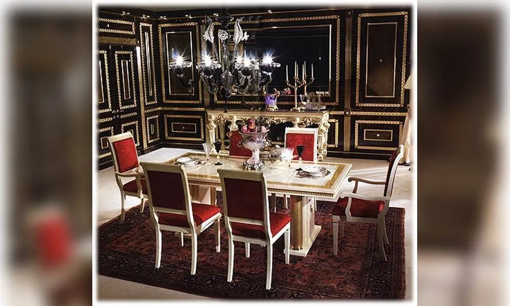 Прямоугольный обеденный стол. Декорирован полосой из золотой фольги. Декор ручной работы. Возможны другие цветовые варианты отделки.