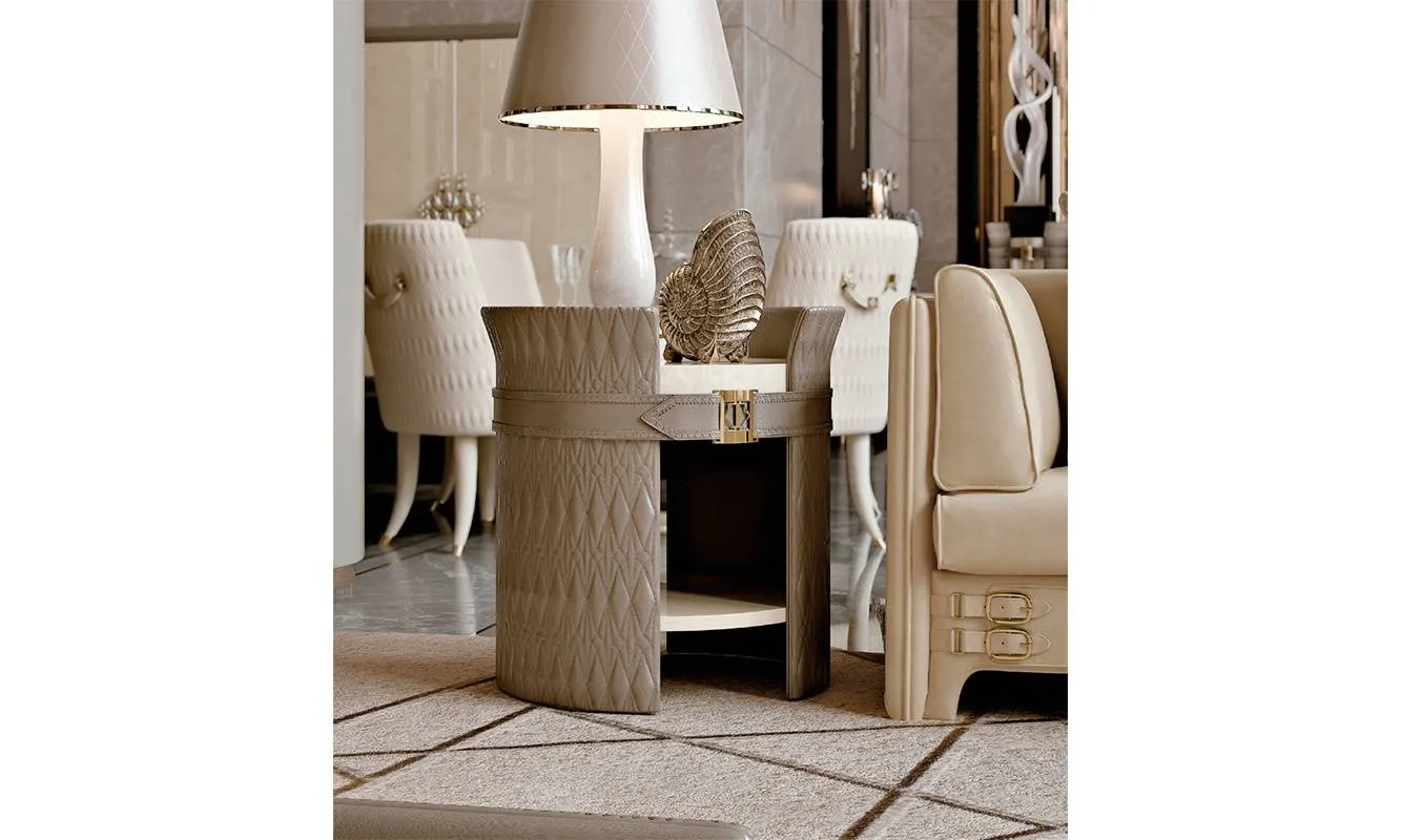Круглый столик с деревянной структурой. Частично обит кожей, декор выполнен вручную. Возможны другие виды отделки и обивки.