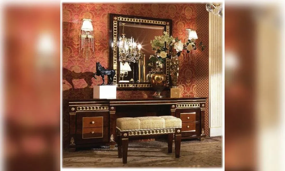 Туалетный столик с 4-мя выдвижными ящиками. Декоративные металлические детали со встроенными затененными зеркалами. Декор ручной работы. Возможны другие цветовые варианты отделки.