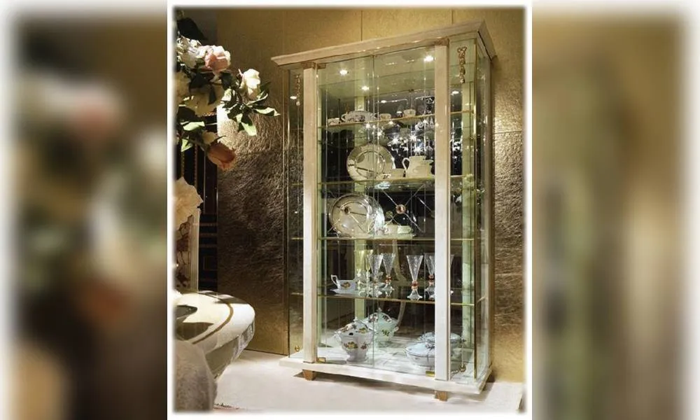 2-х дверная витрина из закаленного стекла с декоративной гравюрой. Зеркальная задняя стенка. Внутренние полки выполнены из стекла. Галогеновая подсветка в верхней плоскости по желанию заказчика. Декор ручной работы. Возможны другие цветовые варианты отделки.